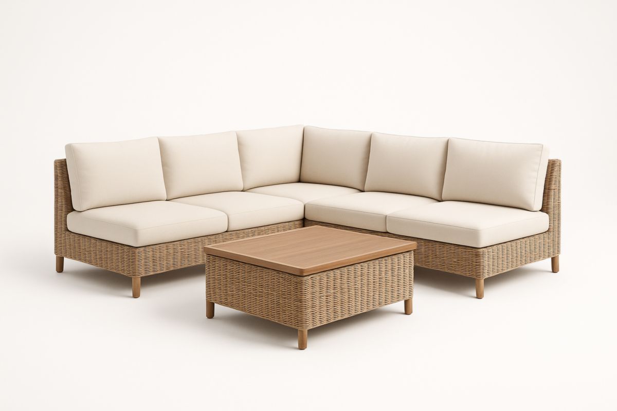 Divano angolare in rattan con tavolino da caff?? in legno Crema