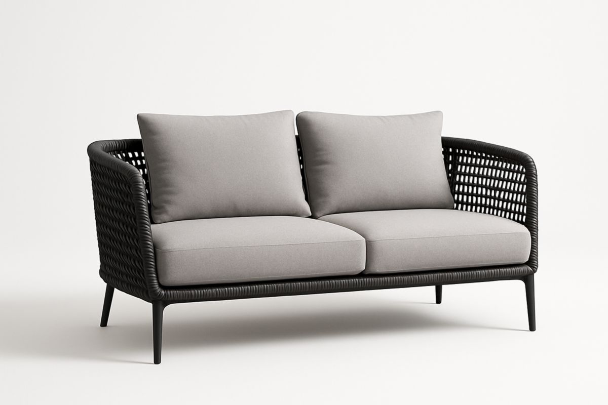 Divano Due Posti in Metallo e Corda con Cuscini in Poliestere Grigio