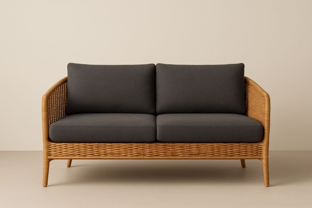 Divano Due Posti in Rattan Sintetico con Cuscini in Tessuto Grigio