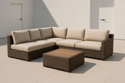 Set Divano Angolare da Giardino in Rattan Marrone con Cuscini Beige e Tavolino